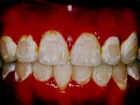 歯磨きをサボると、金具(ブラケット)の回りが白濁してしまいます。 この白濁は歯並びが治った後も残ってしまいます。